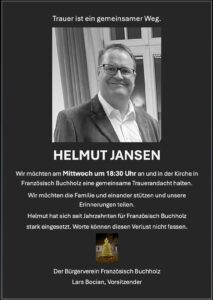 Am Weihnachtsbaum vor der Kirche, den Helmut intensiv pflegte, möchten wir ein Licht abstellen und auch in der Kirche zusammenkommen. Auch hier möchten wir ein Licht entzünden und seinem stetigen Einsatz für Französisch Buchholz gedenken.